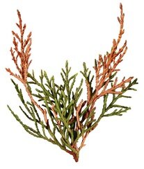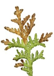Neben Thujen findet man diesen Pilz auch auf Scheinzypressen. Bei dieser durch einen Pilz bedingten Krankheit verfärben sich die Triebspitzen zuerst gelb, dann braun. Es ist eine scharfe Abgrenzung zwischen gesunden und kranken Pflanzenteilen zu erkennen. Auf den bereits abgestorbenen Trieben kann man dunkle Pusteln erkennen, die die Sporenlager des Pilzes sind. Verstärkt tritt der Pilz in schattigen Lagen auf. Es besteht Verwechslungsgefahr mit der Thujaminiermotte.